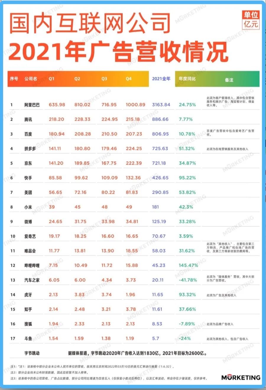 Morketing發(fā)布中國18大互聯(lián)網(wǎng)公司2021年廣告收入榜顯示,根據(jù)各家財報,阿里巴巴以絕對收入優(yōu)勢位列榜首,收入達3164億元(含營銷服務(wù)和展示廣告,淘寶客計劃、傭金收入等);騰訊、百度(含愛奇藝)緊隨其后。