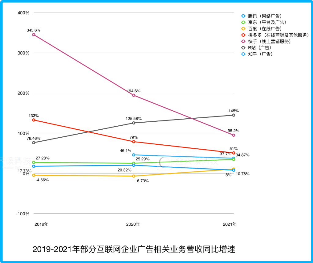 財報顯示,2022年一季度,B站廣告收入同比增長46%、快手線上營銷服務(wù)收入同比增長32.6%,對比來看,騰訊網(wǎng)絡(luò)廣告營收同比下滑21.3%,百度在線廣告收入同比下滑4%。