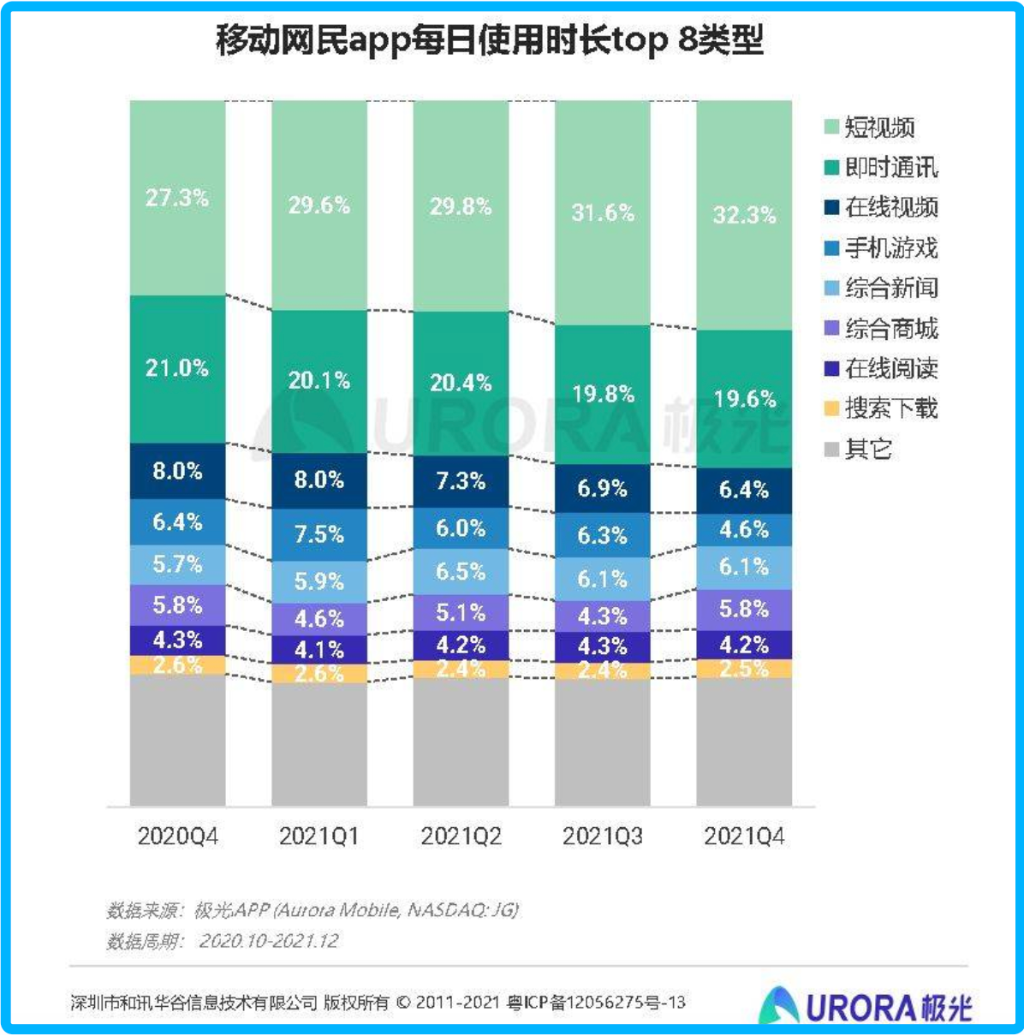 根據(jù)極光大數(shù)據(jù)發(fā)布的報告,短視頻、即時通訊、在線視頻和手機游戲為目前移動網(wǎng)民App每日使用時間最長的四類應(yīng)用;尤其是用戶短視頻使用時長占比漲勢明顯,從2020年Q4的27.3%已經(jīng)上升至2021年Q4的32.3%,遠超其它類型應(yīng)用;而綜合新聞和綜合商城占網(wǎng)民日使用時長的比重僅保持在4%-7%的水平。