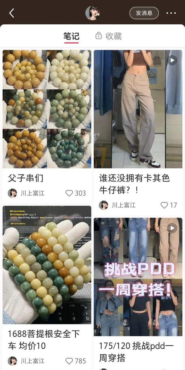 “第一次接觸菩提根還是在淘寶直播間,后來在小紅書上被安利了各種顏色的菩提根,就徹底入坑了!20歲的富江還在讀大學(xué),在她的小紅書主頁,除了各種年輕女孩的穿搭、美妝,還有不少菩提根手串。