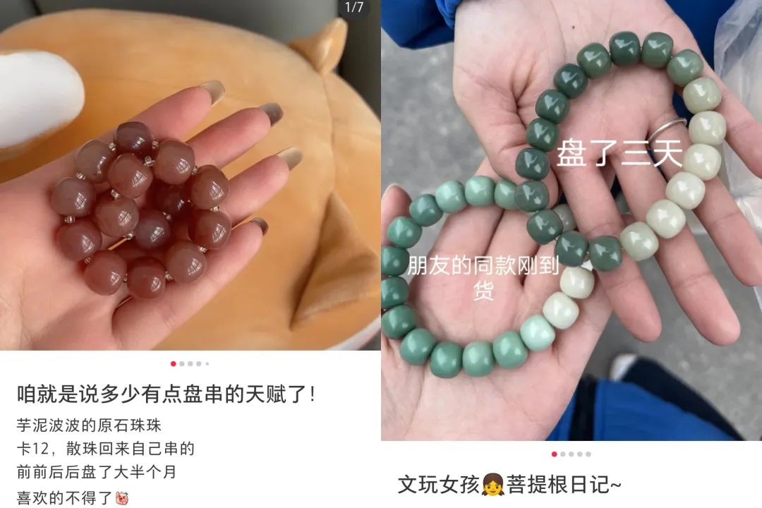 在內(nèi)容平臺上種草文玩的越來越多,入坑有中年男性,也有不少年輕女性,她們在小紅書、抖音上發(fā)布著各種關(guān)于盤菩提根手串的筆記、視頻,稱呼自己為“盤串女孩”“文玩女孩”,和網(wǎng)絡(luò)上調(diào)侃的盤串“中年油膩男”形成了鮮明對比。