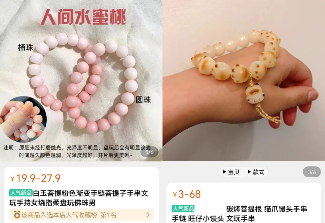 做了多年文玩手串的商家蕓蕓告訴「電商在線」,之前普通的菩提根被很多資深文玩人認為是“通貨”,不值得盤玩,收藏價值不高,也沒什么升值空間。之前比較火的是星月菩提、白玉菩提等,去年菩提根突然被年輕女生們“盤活了”,很多商家就開始做起這個生意。