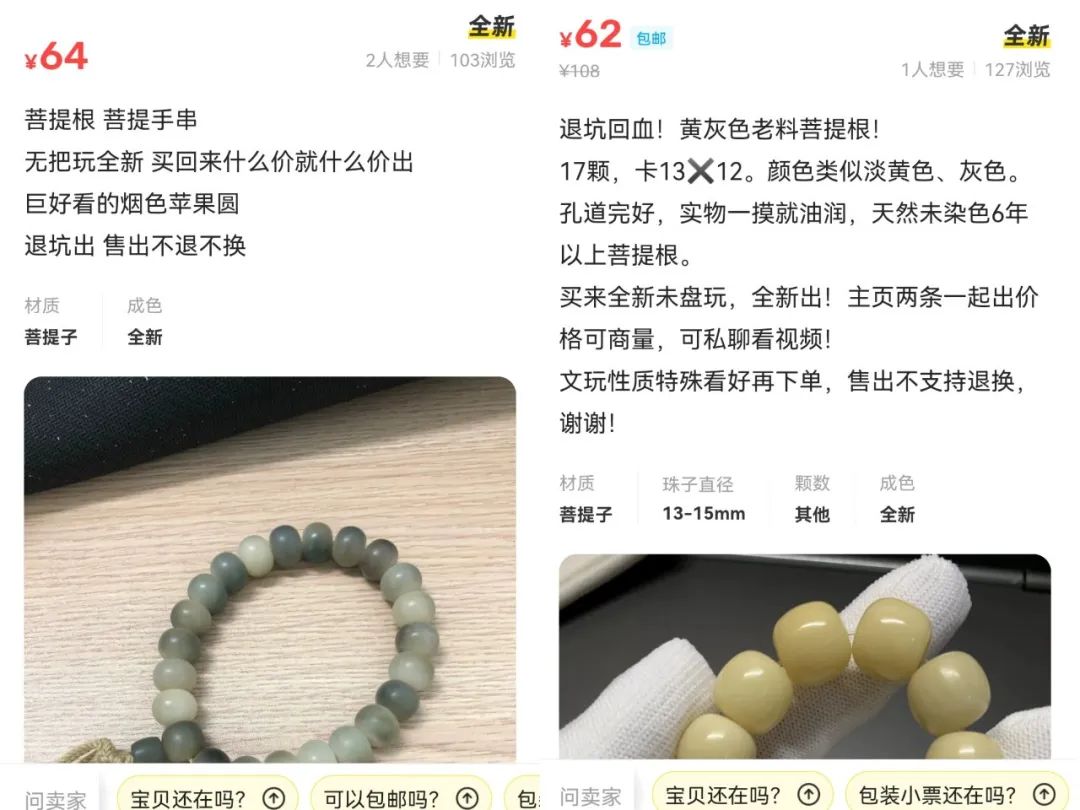 對新事物感興趣和失去興趣同樣快速的年輕消費者,也很難成為文玩電商的長久客戶:閑魚上,出售自己購買的菩提根、佘太翠、駝骨或者阿拉善的年輕女性不在少數(shù),標題都寫著“退坑回血”,不少主頁還寫著全新未盤玩。