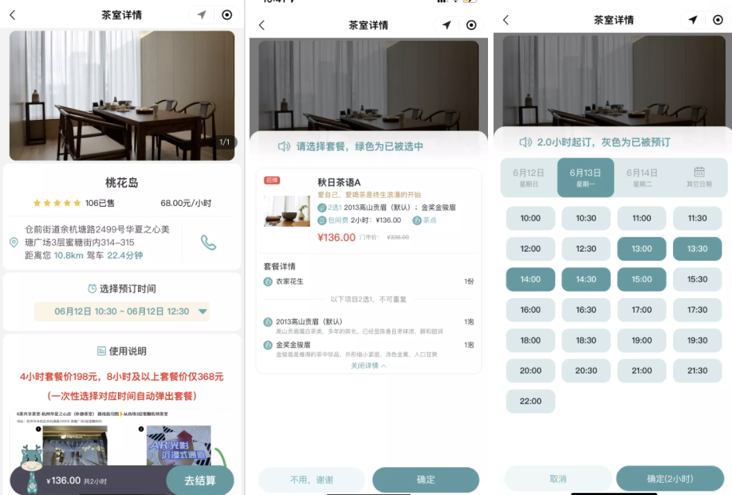 大體的模式是通過手機端選擇茶室,預(yù)定包廂,選擇預(yù)定時間,到店后掃描使用包廂,茶葉和茶點可以到販貨機自行購買。