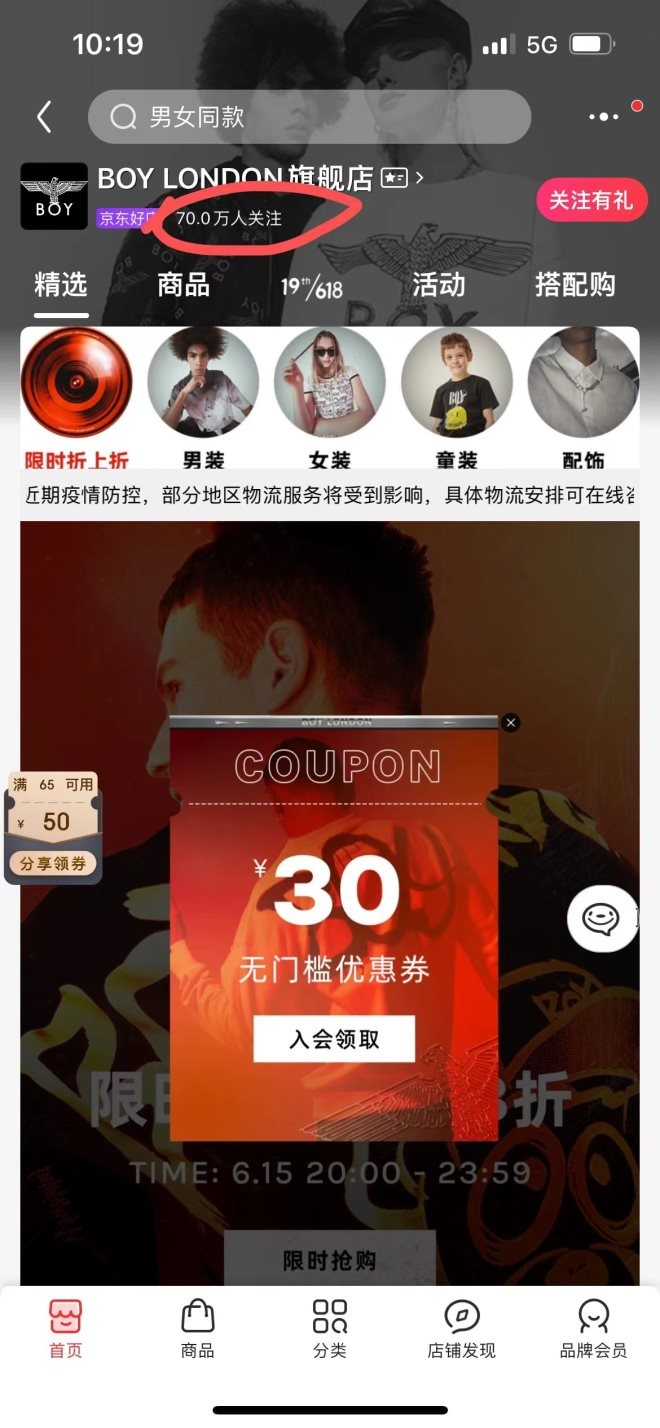 去年年底,除了抖音平臺,BOY LONDON在天貓、京東的旗艦店均掛出了關店清倉的海報,表示品牌天貓旗艦店即將于12月月底正式關店,京東旗艦店雖未標明正式關店日期,但也醒目地標注了“限時拋售,一件不留”。彼時數(shù)據(jù)顯示,BOY LONDON天貓旗艦店粉絲為184萬,京東旗艦店粉絲66.9萬,抖音旗艦店粉絲為14.9萬。
