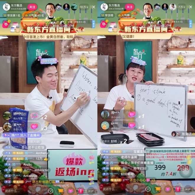 6月10日,“東方甄選”直播間在抖音迅速走紅,起因是帶貨主播使用中英雙語(yǔ)講解產(chǎn)品,同時(shí)進(jìn)行英語(yǔ)教學(xué)并在題板上進(jìn)行單詞和詞組的書寫解讀,時(shí)不時(shí)地還會(huì)拋出一些段子抖包袱,有趣而生動(dòng)。