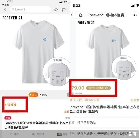 值得注意的是,天貓上的“Forever21女裝旗艦店”所售產(chǎn)品與模特均與Forever21微信商場(chǎng)大相徑庭,而“Forever21男裝旗艦店”的產(chǎn)品雖與FOREVER21微信商場(chǎng)有同款商品,但同款商品售價(jià)卻差出了10倍。例如一款宣傳圖片相同的男士短袖,“forever21男裝旗艦店”售價(jià)為699元,F(xiàn)OREVER21微信商城售價(jià)卻僅有55.3元。