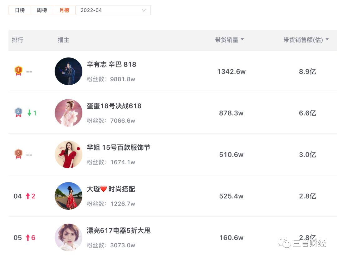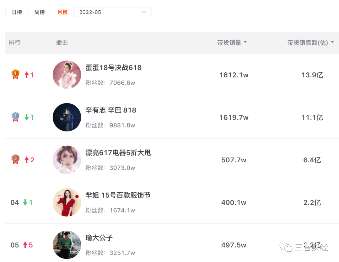 從銷售額月榜來看,3月第一名是蛋蛋;4月前兩名為辛巴、蛋蛋;5月前三名為蛋蛋、辛巴、時大漂亮。