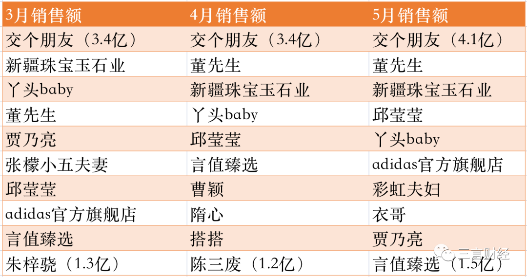 從月銷售額來看,交個朋友依然牢牢占據(jù)第一的位置,其3、4、5月的月銷售額都超過3億。