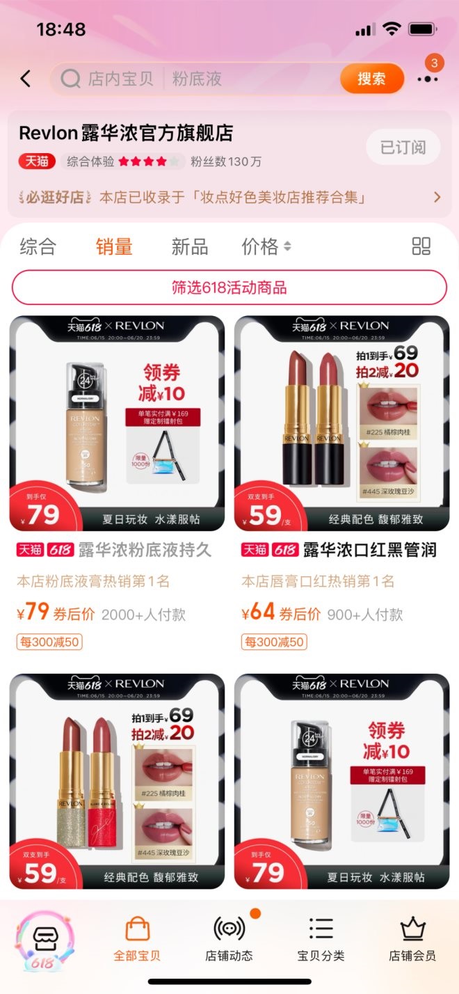 而露華濃的SKU這么多年基本沒(méi)有大的變化,目前其在淘寶的官方旗艦店中也僅有25個(gè)SKU,其中銷量最高的依然是經(jīng)典的持妝粉底液。