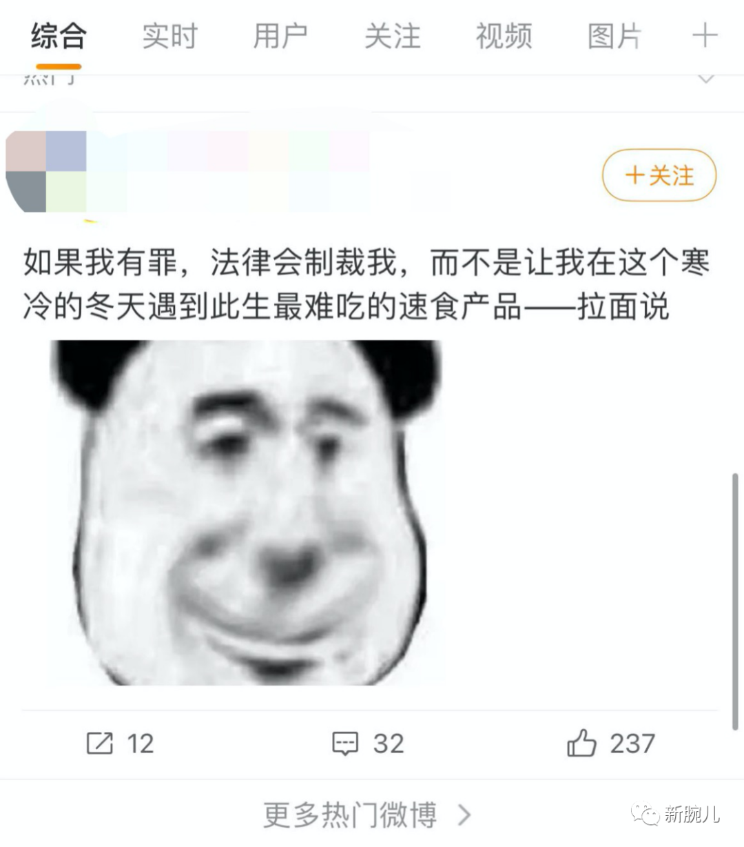 尤其是微博上,某四百萬粉絲博主稱“如果我有罪,法律會制裁我,而不是讓我在這個寒冬遇到此生最難吃的速食產品——拉面說!