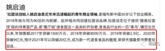 他們對外講過很品牌故事,例如天貓拉面銷售TOP1、全網熱銷5000萬+……自稱為食品行業(yè)黑馬,2017年銷售額突破1500萬元、2018年突破8000萬元、2019年突破2.5億元、2020年突破9億元,預計2021年銷量突破20億……
