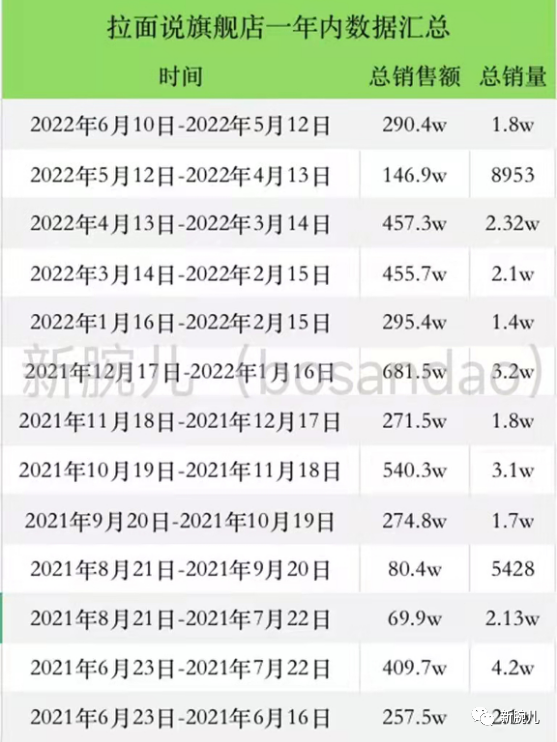10億,是什么概念?也就是說,拉面說每月要完成近1億元銷售額。如今,拉面說旗艦店掉粉,與當年一系列營銷故事和亮眼的數據表現(xiàn),形成鮮明的對比。