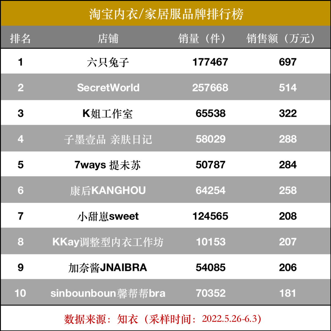 根據(jù)知衣統(tǒng)計(jì)的淘寶618預(yù)售榜單,淘寶店鋪的內(nèi)衣/家居服品牌前十名的銷售額在181萬元之697萬元之間,雖然與大品牌相差甚遠(yuǎn),但對于低成本的店鋪來說的確算得上是一門好生意。