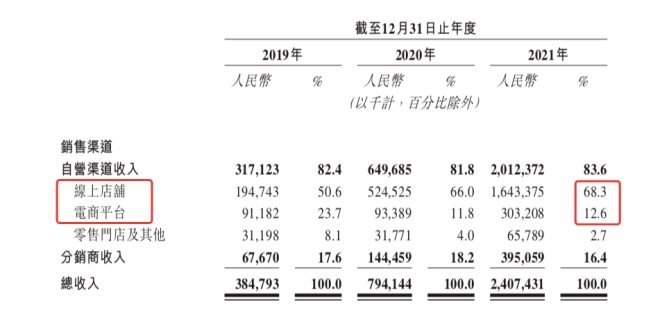 招股書顯示,2021年蕉下自營渠道營業(yè)收入達(dá)到20.12億元,占比總營收83.6%。其中線上店鋪及向電商平臺(tái)銷售收入占比分別高達(dá)68.3%和12.6%。而截至2021年末,蕉下旗下872家分銷商,僅分割了總營收的16.4%。