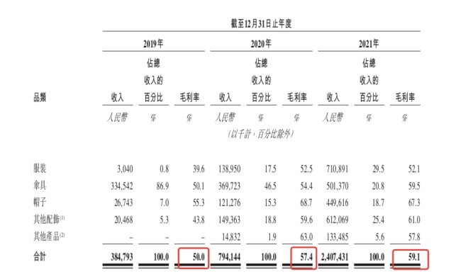 蕉下的毛利率非常高,2019年、2020年和2021年三年的毛利率分別是50.0%、57.4%及59.1%,而且呈現(xiàn)上升趨勢(shì)。