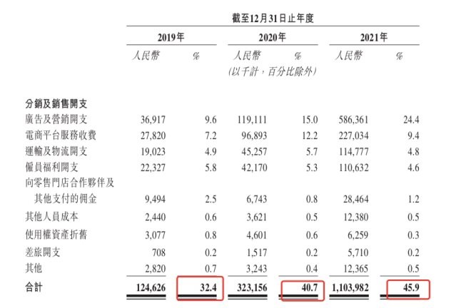 2019至2021年,蕉下花費(fèi)在廣告及營銷上的開支分別為3691萬、1億1911萬、5億8636萬,分別占比當(dāng)年收入9.6%、15%、24.4%;公司分銷及銷售開支分別為1.25億元、3.23億元、11.04億元,占比當(dāng)年?duì)I收32.4%、40.7%、45.9%。