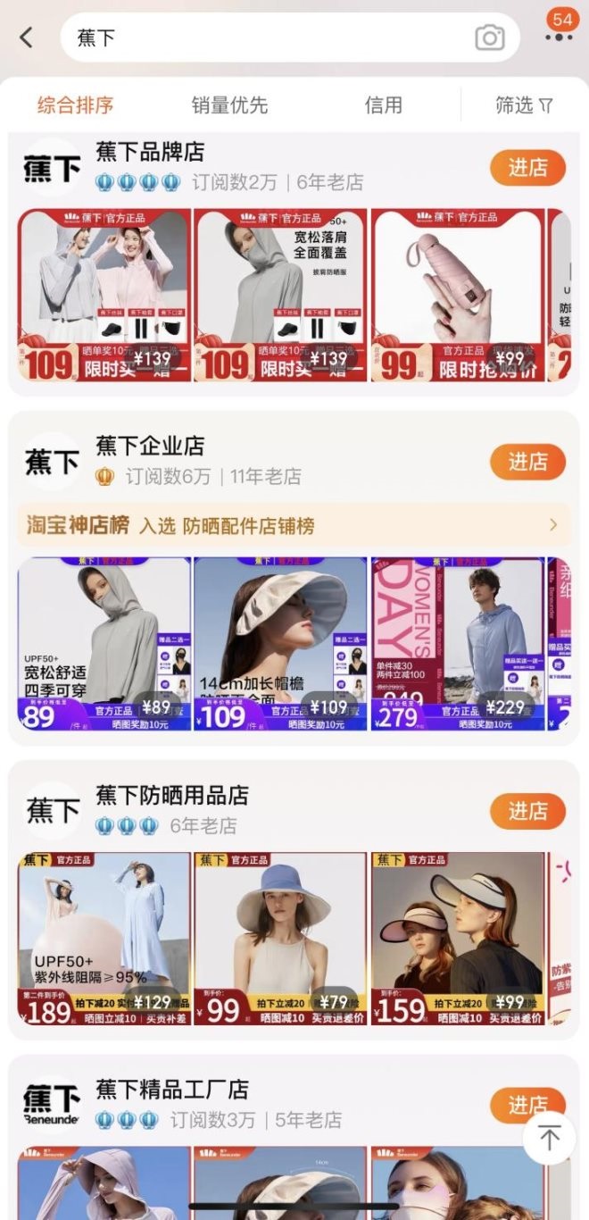 由于蕉下全部采用代工模式,在生產(chǎn)中的“保密”環(huán)節(jié)自然大到折扣。在淘寶上搜索“蕉下”查詢店鋪,官方店、專賣店、自營店、直銷店、品牌店等等各種類型的店鋪都有,所售賣的產(chǎn)品也真假難辨。