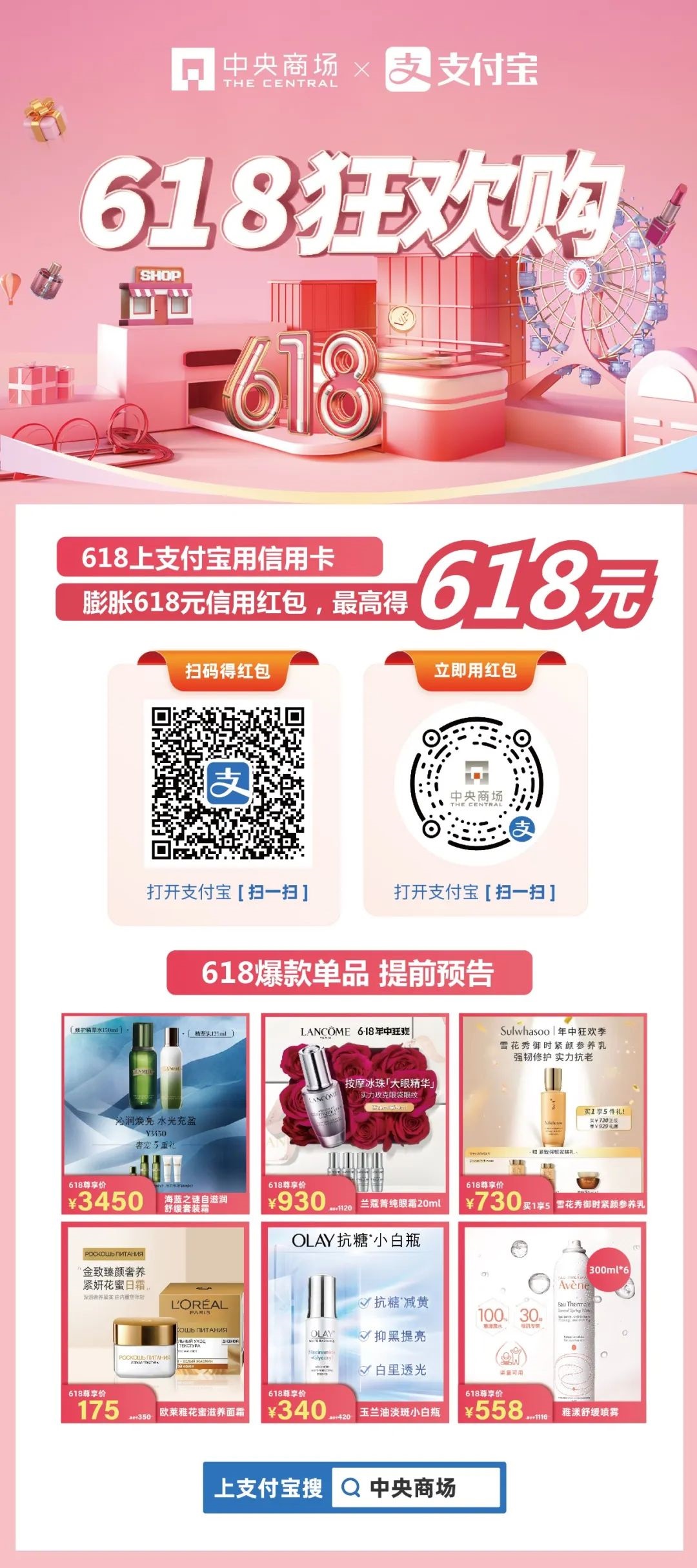 中央商場攜手支付寶,發(fā)力線上!同步開啟支付寶小程序618精選會場!超多爆款單品提前預(yù)告,疊加支付寶卡卡優(yōu)惠,最高領(lǐng)618元無門檻紅包,好物0元秒到手!精選會場涵蓋了精選黃金珠寶、大牌美妝、潮牌聯(lián)名服飾等多品類精選商品,充分滿足顧客618的多元購物需求。還有,海藍(lán)之謎、蘭蔻、雅詩蘭黛、嬌韻詩......超多大牌套裝一口價,618倒計時,買到就是賺到!