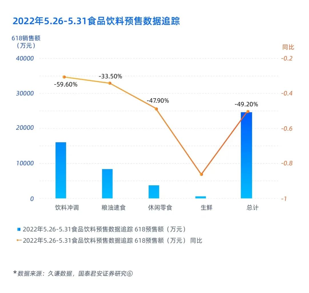 于是出現(xiàn)了一個(gè)堪稱矛盾的現(xiàn)象:根據(jù)今年久謙、國(guó)泰君安向36氪提供的618預(yù)售數(shù)據(jù),食品飲料主要類目銷售額均有明顯下滑——飲料沖調(diào)、糧油速食下滑了30.5%和33.5%,休閑零食預(yù)售額幾乎折半。