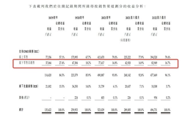 據(jù)“友和”招股書,其“線下零售店”(觀塘店、長(zhǎng)沙灣旗艦店)銷售額占比,18/19財(cái)年、19/20財(cái)年、20/21財(cái)年及21/22財(cái)年前8個(gè)月,分別為27.4%、18.2%、14.8%、16.7%。線下銷售額呈增長(zhǎng)態(tài)勢(shì),但增速整體不及大盤,原因在于香港線下零售業(yè)年復(fù)合增長(zhǎng)率低于線上。