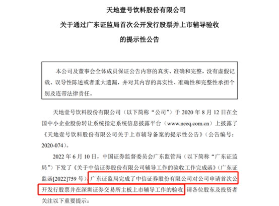 投資界-天天IPO獲悉,天地壹號廣東證監(jiān)局下發(fā)了驗收工作完成函,廣東證監(jiān)局完成了中信證券對公司申請首次公開發(fā)行股票并在深圳證券交易所主板上市輔導(dǎo)工作的驗收。6月15日,天地壹號發(fā)布股票停牌公告,意味著正式吹響了IPO號角。