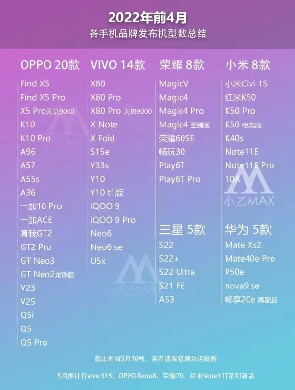 根據(jù)微博大V小乙MAX統(tǒng)計(jì),2022年前4月,OPPO發(fā)了20款新機(jī)型,vivo發(fā)了14款(兩者均包含子品牌),榮耀和小米(包括紅米)各有8款,均超出了去年同期的水平。如果把5月份各廠商沖擊618發(fā)布的機(jī)型算進(jìn)去,這一數(shù)字將更可觀。