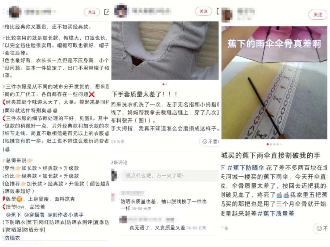 不過,走“奢侈”路線的蕉下,產(chǎn)品質(zhì)量沒少被消費者吐槽,比如防曬傘的傘架斷掉,防曬衣味道臭、走線差,“和地攤貨有一拼”,手套脫線、布料裂開等。