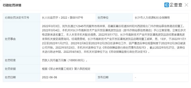 6月20日消息,企查查APP顯示,長沙一書亦燒仙草門店因招用童工被長沙市人力資源和社會保障局處以1萬元罰款。