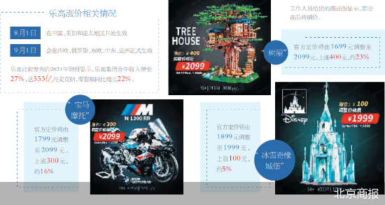 據(jù)某樂高工作人員給出的漲價(jià)商品圖來看,“樹屋”的官方定價(jià)將由1699元調(diào)整至2099元,上漲400元,約23%;“寶馬摩托”的官方定價(jià)由1799元調(diào)整至2099元,上漲300元,約16%;“冰雪奇緣城堡”的官方定價(jià)將由1899元調(diào)整至1999元,上漲100元,約5%;此外,“樂高花束”將漲價(jià)100元的消息也在這組圖中。