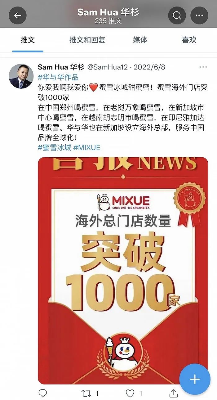 蜜雪冰城悄無聲息地在東南亞張開了巨網(wǎng)。上海華與華營銷咨詢有限公司自2018年起為蜜雪冰城提供品牌咨詢服務(wù),其董事長華杉于6月8日在社交平臺上發(fā)文,表示蜜雪冰城海外門店已突破1000家。
