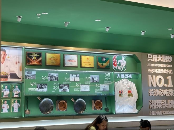 經過半年的準備,費大廚北京首店開門迎客。北京商報記者從現(xiàn)場看到,北京首店以白綠色調為主,與其他城市門店裝修風格相同,門頭上標有“全國小炒肉大王”的標識,門店中也能看到“長沙必吃菜第一”和“長沙地標美食名片”等字樣。