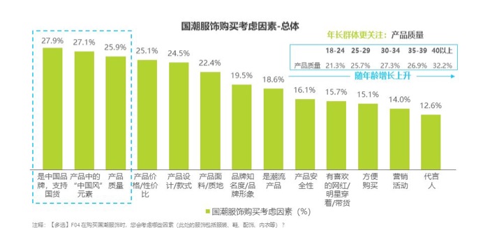 同樣走國貨情懷營銷路線的還有安踏、回力等老品牌,但消費者買國潮服飾不單單是在用愛發(fā)電。艾瑞數(shù)據(jù)曾做過相關(guān)研究,除了支持國貨外,對于國潮服飾購買另外兩大考慮因素為產(chǎn)品中的中國風元素、產(chǎn)品質(zhì)量,營銷活動和代言人只是錦上添花。