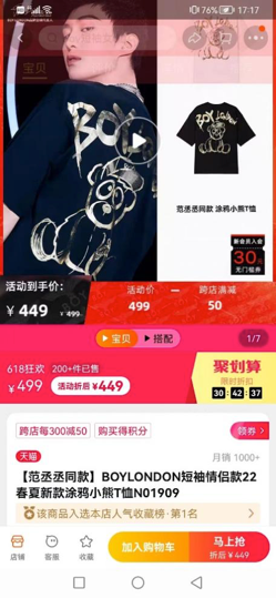 截止至6月19日,BOY LONDON官方旗艦店粉絲數(shù)只有86603人,銷量最高的為BOY LONDON涂鴉小熊T恤月銷僅有1000+,淘寶寶貝評論僅300+,這還是在打著范丞丞同款名號下的熱銷,其他商品銷量大多為三位數(shù)。