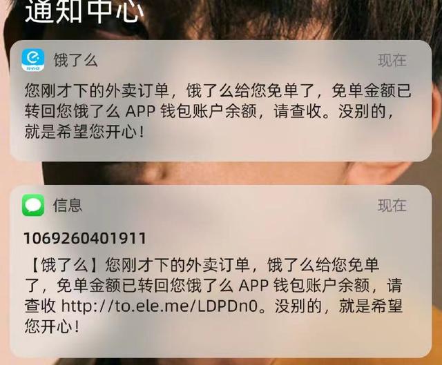 從網(wǎng)友截圖來看,餓了么APP和短信均進(jìn)行了免單消息推送。