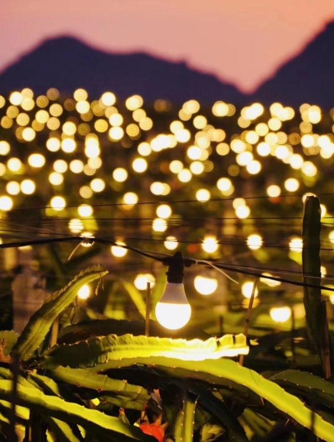 6月中旬廣西隆安,因“燈!弊呒t的萬(wàn)畝火龍果基地碩果累累。晚上8點(diǎn),火龍果基地準(zhǔn)時(shí)亮起大片LED照明燈,璨若星河,不時(shí)有游客前來(lái)打卡。通過(guò)補(bǔ)光照明結(jié)出的“浪漫燈光果”,甜度佳、產(chǎn)能高,質(zhì)優(yōu)價(jià)廉,跟隨社區(qū)電商銷往大江南北的縣城和村鎮(zhèn)。