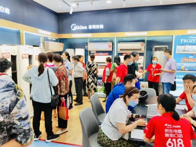 “今年高溫來(lái)的比較早,大家都集中高溫段購(gòu)買空調(diào),在選購(gòu)家電時(shí),更容易被節(jié)能、智能、環(huán)保型綠色家電種草!痹诰〇|電器揚(yáng)州店,導(dǎo)購(gòu)員向記者介紹幾款熱銷的空調(diào)型號(hào),高溫跳高以來(lái),到門店選購(gòu)空調(diào)的消費(fèi)者明顯增加,一天要接待大幾十位客戶!皟汕г寥f(wàn)元的空調(diào)都有現(xiàn)貨,格力、海爾、美的、TCL、海信等品牌比較熱賣,還有高端系列的卡薩帝、colmo的新風(fēng)空調(diào),非常受年輕人歡迎。”