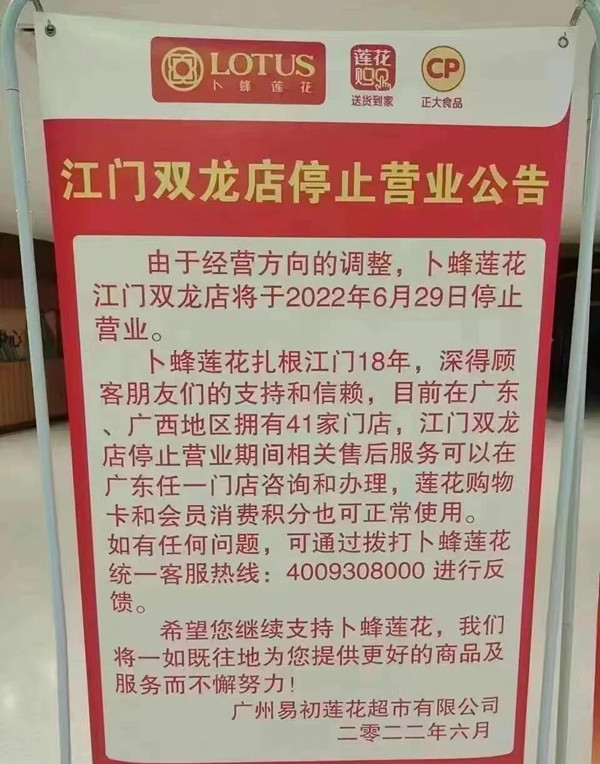 近日,廣州易初蓮花超市有限公司發(fā)布公告稱(chēng),由于經(jīng)營(yíng)方向的調(diào)整,卜蜂蓮花江門(mén)雙龍店將于6月29日停止?fàn)I業(yè)。