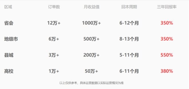 除了對資源明碼標(biāo)價(jià)之外,為更快速擴(kuò)張,這家小型運(yùn)營商配上非常誘人的投資回報(bào)率,大搞加盟模式。比如在省會城市,每天的訂單數(shù)可以達(dá)到12萬以上,月收益達(dá)到1000萬元以上,一年之內(nèi)回本,三年投資回報(bào)率可達(dá)350%,如果是在縣城,即便每天的訂單量3萬多,也能在一年之內(nèi)回本,三年內(nèi)回報(bào)率高達(dá)550%。