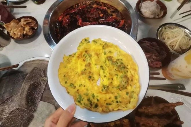 將雞蛋液炸成大片,平攤在盤子上,呈現(xiàn)方式給人份量感十足,拍照也好看。像楠火鍋、洞子火鍋、電臺巷等許多品牌都見到了它的身影。并陸續(xù)出現(xiàn)了雙椒炸蛋,貢菜炸蛋升級版。