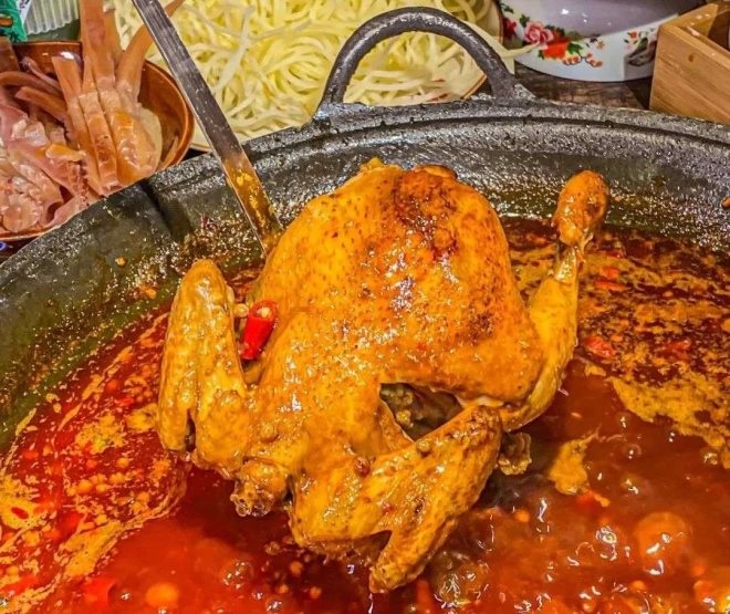 楠火鍋的姐妹品牌杉姐火鍋,上新了一款名為“一整只雞”的火鍋全雞,鹵雞是提前腌制好的,雞肚子里有干花菜和小鮑魚,可以直接吃,也可以在牛油火鍋里燙。