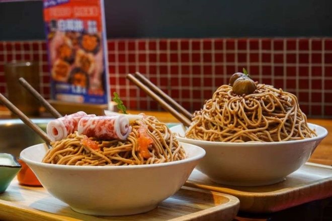 “小面”端上桌,不是湊近感受到冒著冰氣,真的讓人傻傻分不清。面條部分由栗子泥制作而成,綿密沙沙的口感非常細膩,不會甜得齁。