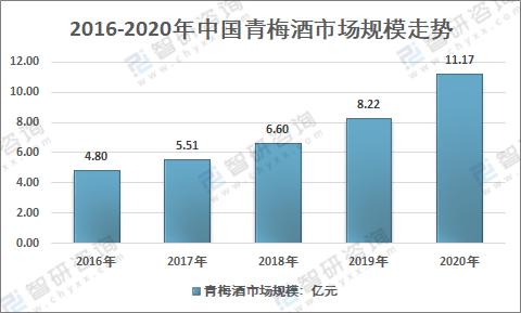 據(jù)中國酒業(yè)協(xié)會援引的行業(yè)數(shù)據(jù)顯示,2020年我國青梅酒產量達到10622千升,同比增長26.1%,而2020年我國青梅酒市場規(guī)模相比前一年增長了35.9%,但也只有11.17億元。