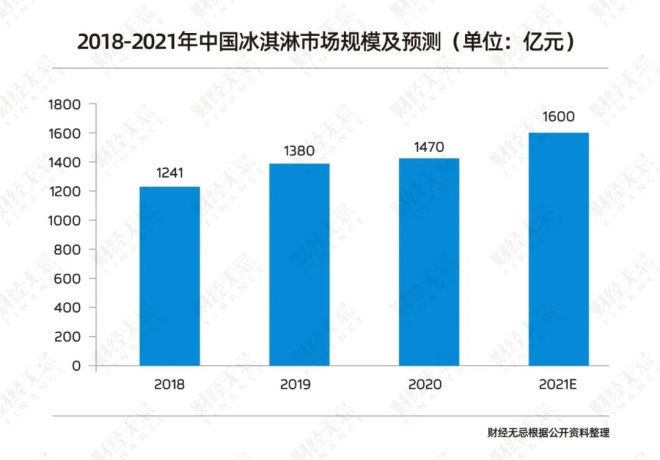前瞻產(chǎn)業(yè)研究院數(shù)據(jù)顯示,2018年,中國冰淇淋市場規(guī)模僅為1241億元,預(yù)計2021年,這一數(shù)字將達(dá)到1600億元,增長28.92%,位居世界第一。