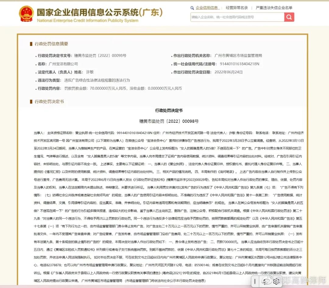 今日(6月27日)上午,鄧高靜在其微博上宣布寶潔因發(fā)布侮辱女性的虛假?gòu)V告被廣州黃埔區(qū)市場(chǎng)監(jiān)管局罰款70萬(wàn)元。