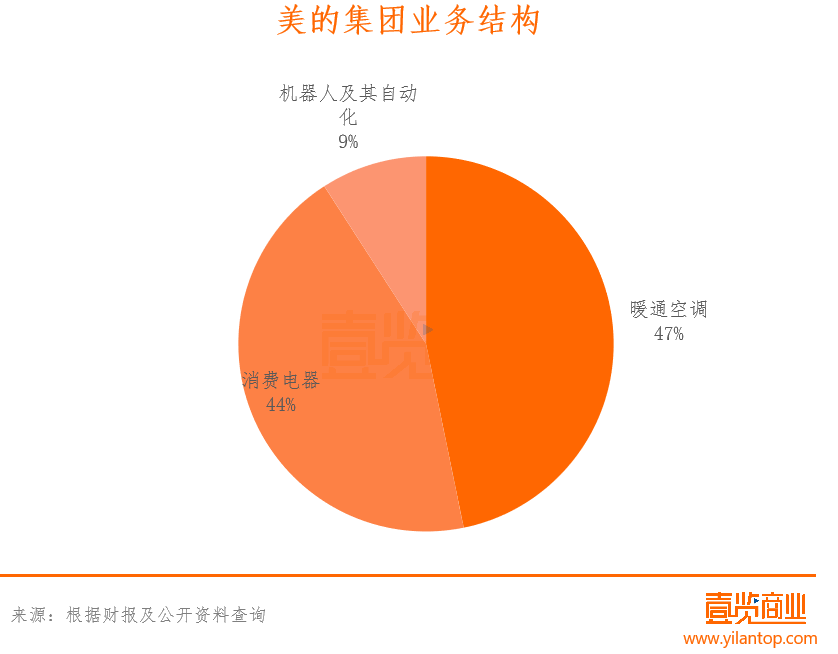 從美的集團的業(yè)務(wù)結(jié)構(gòu)來看,暖通空調(diào)是其最大的收入支柱。財報數(shù)據(jù)顯示2021年美的空調(diào)收入1418.8億元,營收占比41.6%;消費電器收入1318億元,營收占比38.64%;機器人及其自動化系統(tǒng)收入272億元,營收占比7.99%。