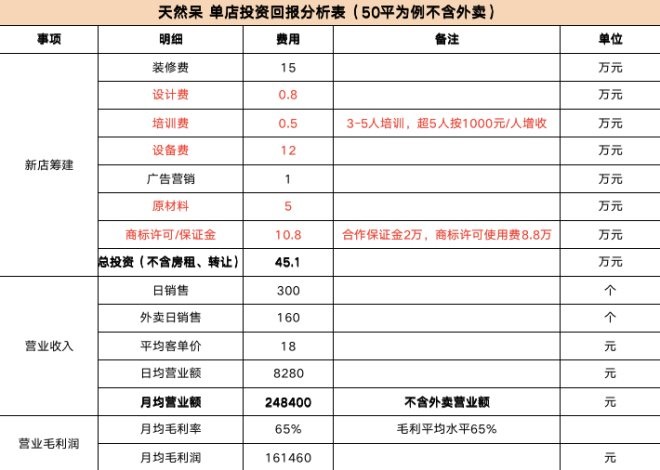 此外,包善榮還認為成都天然呆虛假宣傳回報率。其提供的“天然呆單店投資回報分析表”顯示,天然呆50平米的單店總投資45.1萬元,月均純利潤7.14萬元,約6.32個月便能回本。