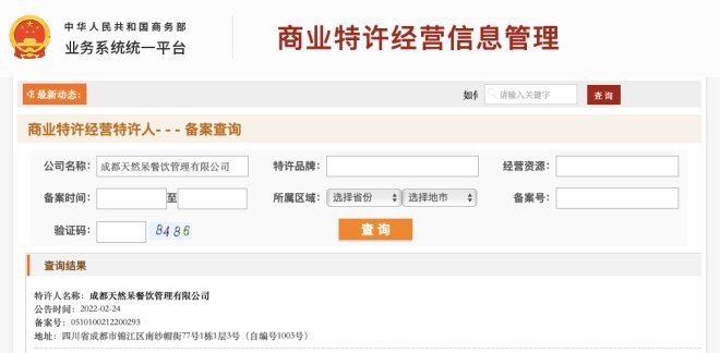 6月27日,時代財經(jīng)登陸商業(yè)特許經(jīng)營信息管理平臺,平臺顯示成都天然呆的備案號為0510100212200293,公告時間為2022年2月24日。也就是說,成都天然呆在還不具備特許經(jīng)營資質時,便授權包善榮特許經(jīng)營權。