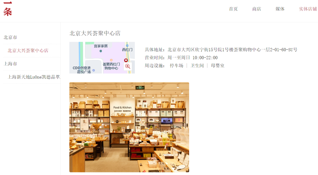 根據(jù)一條官網(wǎng)顯示的內(nèi)容,目前一條在線下還有兩家門店,分別位于北京大興薈聚中心、上海新天地LuOne凱德晶萃廣場(chǎng)。