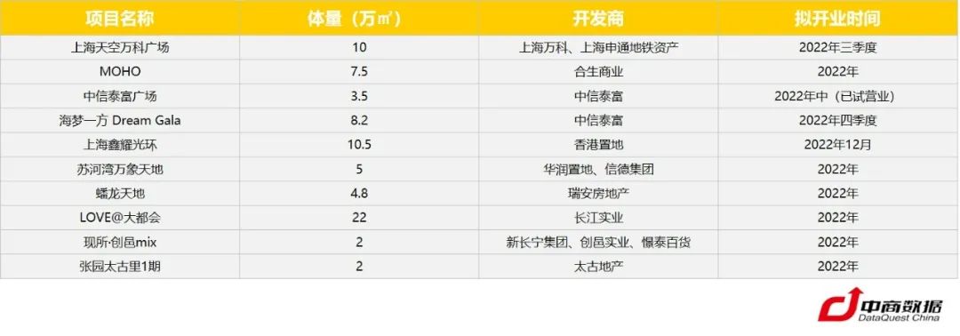 經(jīng)歷2個(gè)月的封控,二季度上海無(wú)大型商業(yè)項(xiàng)目開幕。受疫情影響,部分原定于今年開業(yè)的項(xiàng)目或?qū)⒀悠。下半年,張園西區(qū)、錦滄文華廣場(chǎng)、中信泰富廣場(chǎng)、上海天空萬(wàn)科廣場(chǎng)、蘇河灣萬(wàn)象天地、蟠龍?zhí)斓、MOHO上海、海夢(mèng)一方、上海新天地時(shí)尚II等重點(diǎn)項(xiàng)目將開業(yè)。